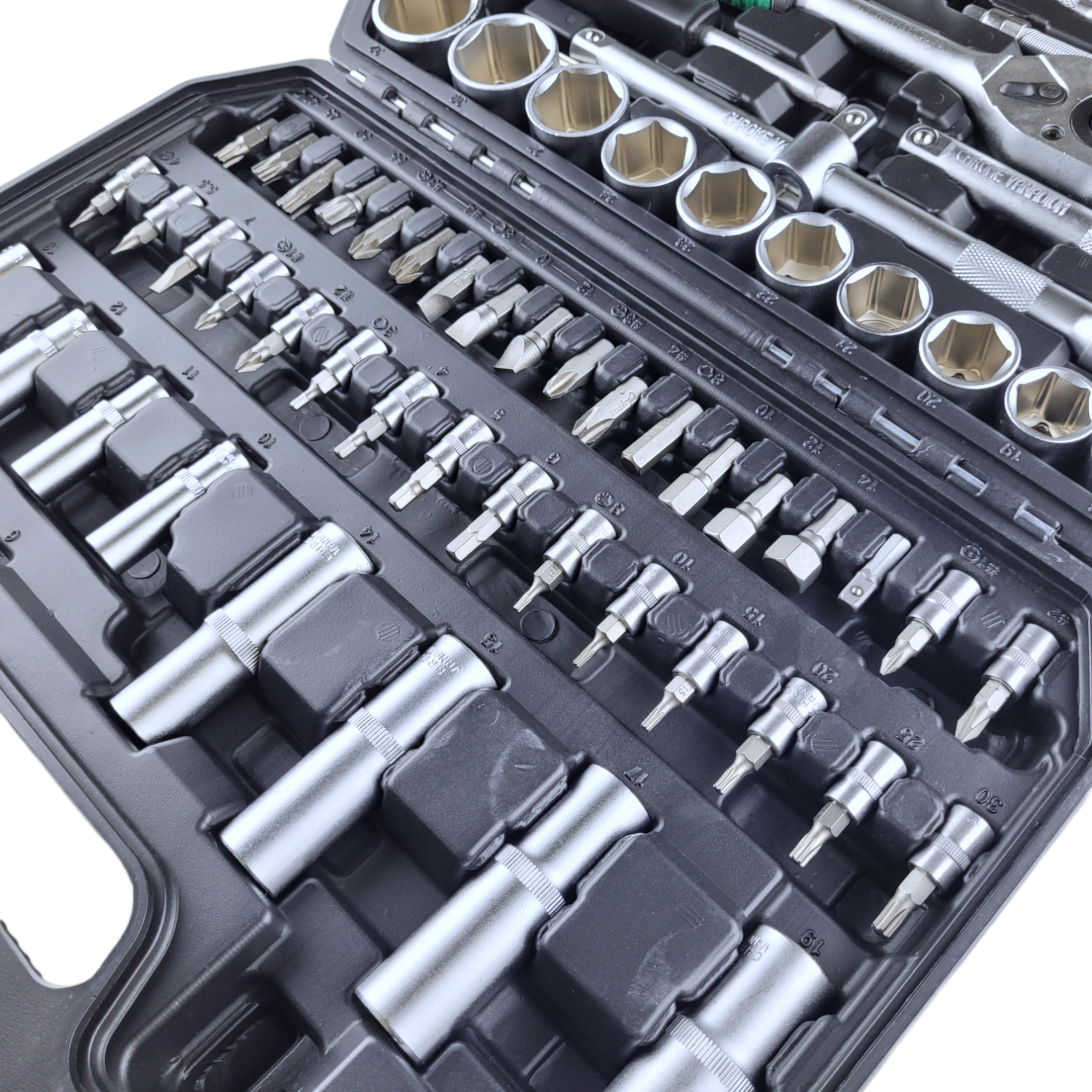Набор инструментов для авто 94 предмета имеет в комплекте ключи-трещотки с обратным реверсом и удобными двухкомпонентными рукоятками. Поставляется профессиональный набор инструментов в удобном, закрывающемся кейсе для надежного хранения и транспортировки.
